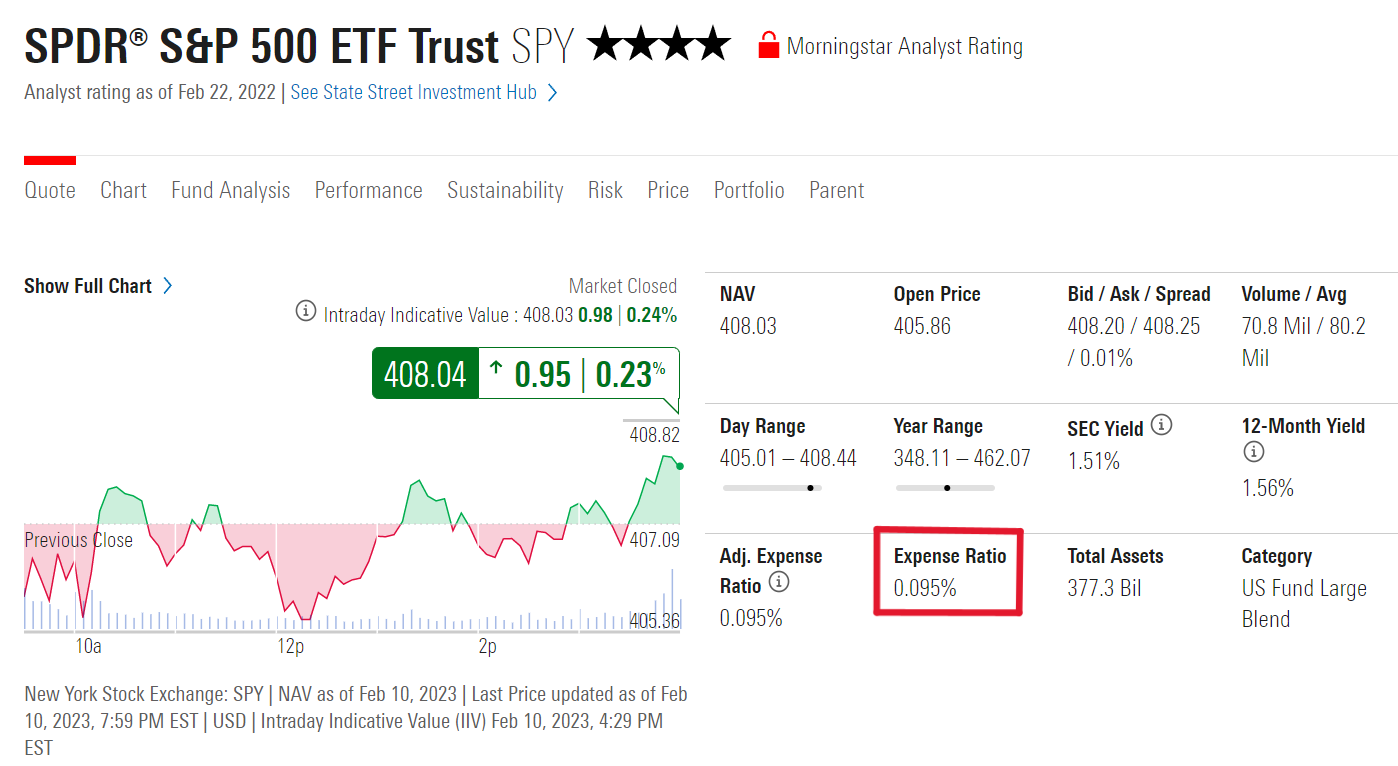 Let's conduct some basic research on SPY, which is the largest ETF in the US (~$380b in assets under management) that seeks to track the performance of the S&P 500 (500 largest companies in the US). After entering the ticker of the fund in the search bar (SPY), we are presented with this page. The most important metric we are looking for is the Expense Ratio. A desirable expense ratio for ETFs will be between 0.5-0.75%, with anything greater than 1.25% being considered high.