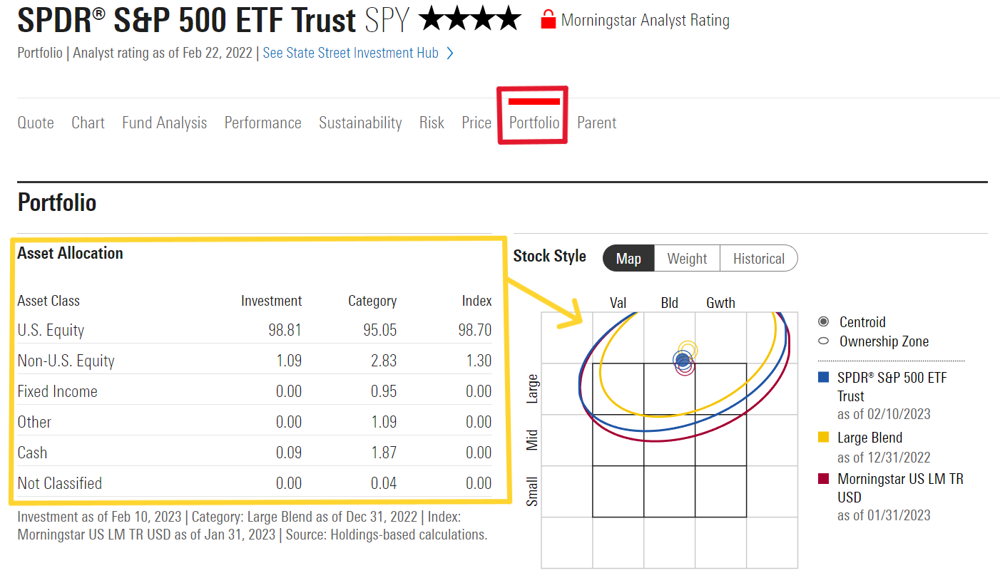 Next, select Portfolio to gain a better understanding of how the fund is invested (red square). The box in yellow displays the fund's allocation and in this case we can see that it is primarily invested in a blend of US equities (stocks), specifically Large-cap stocks (shown by the Morningstar style box the yellow arrow is pointing to).