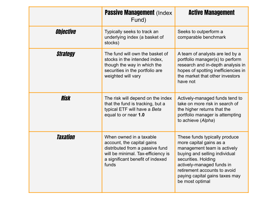 Exchange-Traded Funds (ETFs): These funds tend to focus on tracking the performance of the broader market itself. Rather than buying/selling in an active manner, most ETFs simply purchase the funds of an underlying index in order to track that market and only change the investments within the fund (click on the hyperlink to learn what an index is).