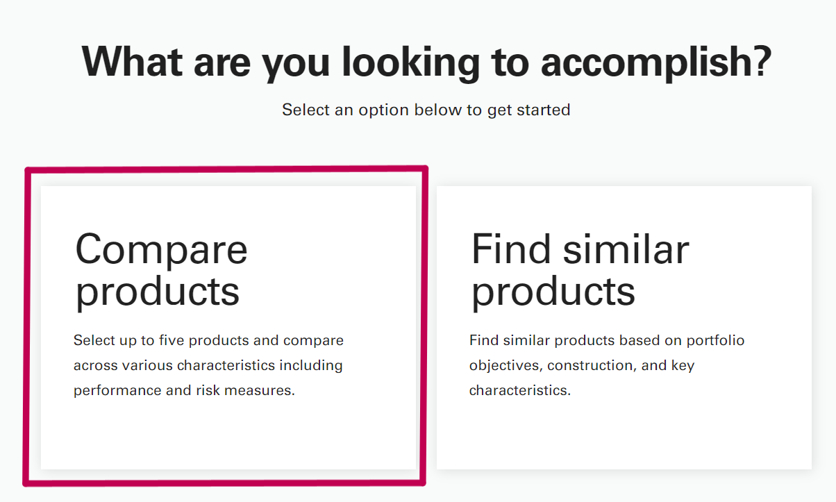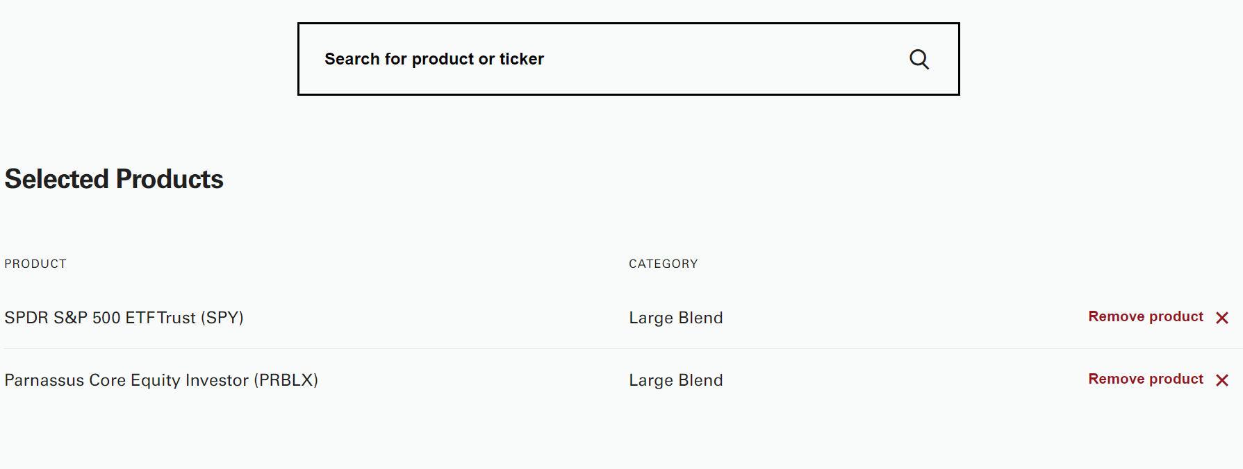 Start by selecting Compare Products, and enter the two funds you wish to compare. Ideally, these will be funds that aim to provide exposure to a similar asset class so as to be a fair comparison. In this example, we will be comparing SPY and PRBLX (both investing in US Large Cap stocks).
