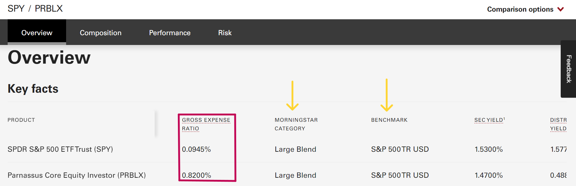 This is helpful when weighing up the pros and cons of comparable investments, which is likely the case for the investment options in your employer-sponsored retirement account. In this situation, a valuable tool to utilize is Vanguard's "Compare Products": https://advisors.vanguard.com/investments/portfolio-construction-tools/compare-products/