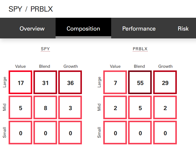 The composition shows us how the fund is invested (these boxes are known as "Morningstar Style Boxes"), here we can see how each fund differs in its allocation. Both funds are tilted toward Large Growth firms, with PRBLX having strong exposure to Blend companies. The exact allocation of each fund differs, but they are relatively similar and worthy of further comparison.