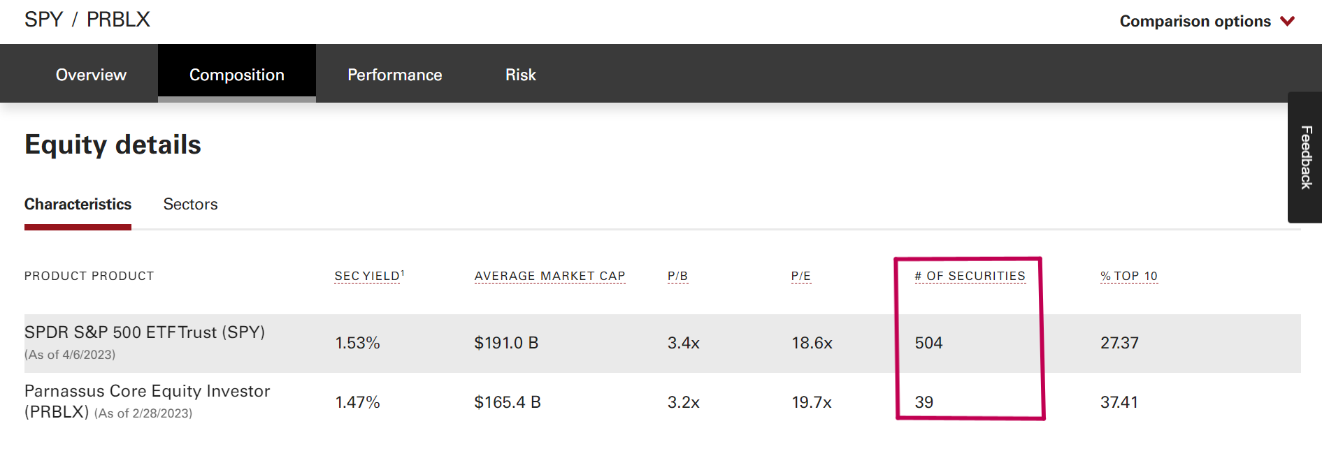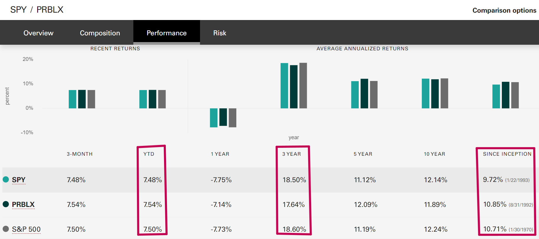 Lastly, let's hone in on one of the most pertinent pieces of information, the past performance record of each investment. The comparison tool will automatically generate a comparison between the S&P500 (listed at the bottom), which tells us that PRBLX outperformed SPY on some occasions.