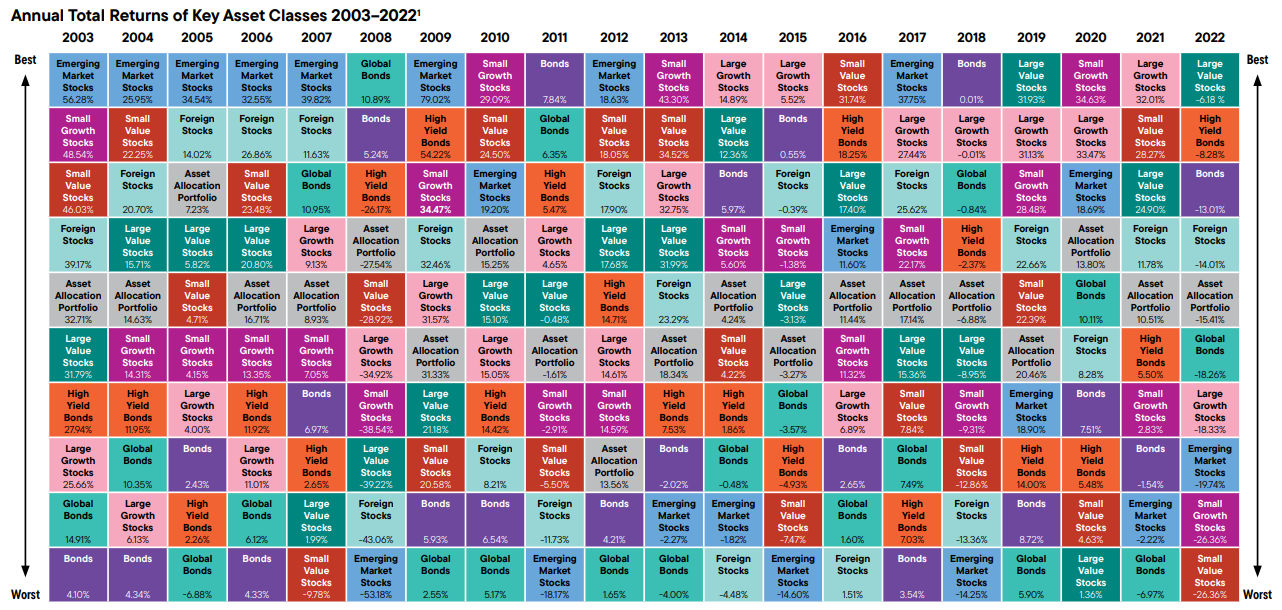 The correct answer is a classic lawyer response, it depends. It depends on the investor's goals, age, and tolerance for risk, among other considerations. Being that the purpose of this site is to relay information in a concise format, we will follow the basic idea of owning a mix of investments. We don't want to put all of our eggs in one basket and risk losing out on the performance of certain asset classes when they perform well relative to others. The chart below showcases the importance of diversification by tracking the performance of each investment since 2003.